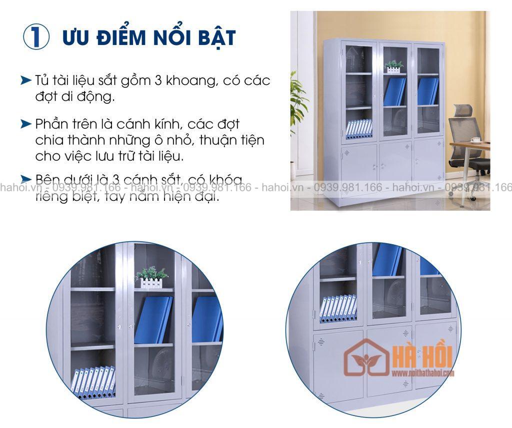 Sản phẩm Tủ tài liệu sắt 3 buồng kính là mẫu tủ mới với kiểu dáng hiện đại, giúp chứa tài liệu sổ sách cho người làm văn phòng, phù hợp nhất cho những người quản lý, kế toán của các công ty và doanh nghiệp. Sản phẩm có kết cấu vững chắc, màu sắc hiện đại, hài hòa và sang trọng cho văn phòng.